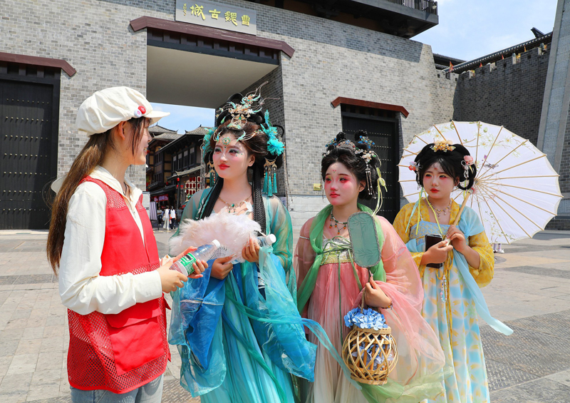 8月19日,许昌雷锋爱心社团志愿者在曹魏古城南城门广场为游客送水。连日来,我市持续高温,大学生志愿者为环卫工人、外卖小哥等户外工作者和游客送水,让他们在高温天气下感受到夏日的清凉。 谭宜姝 摄
